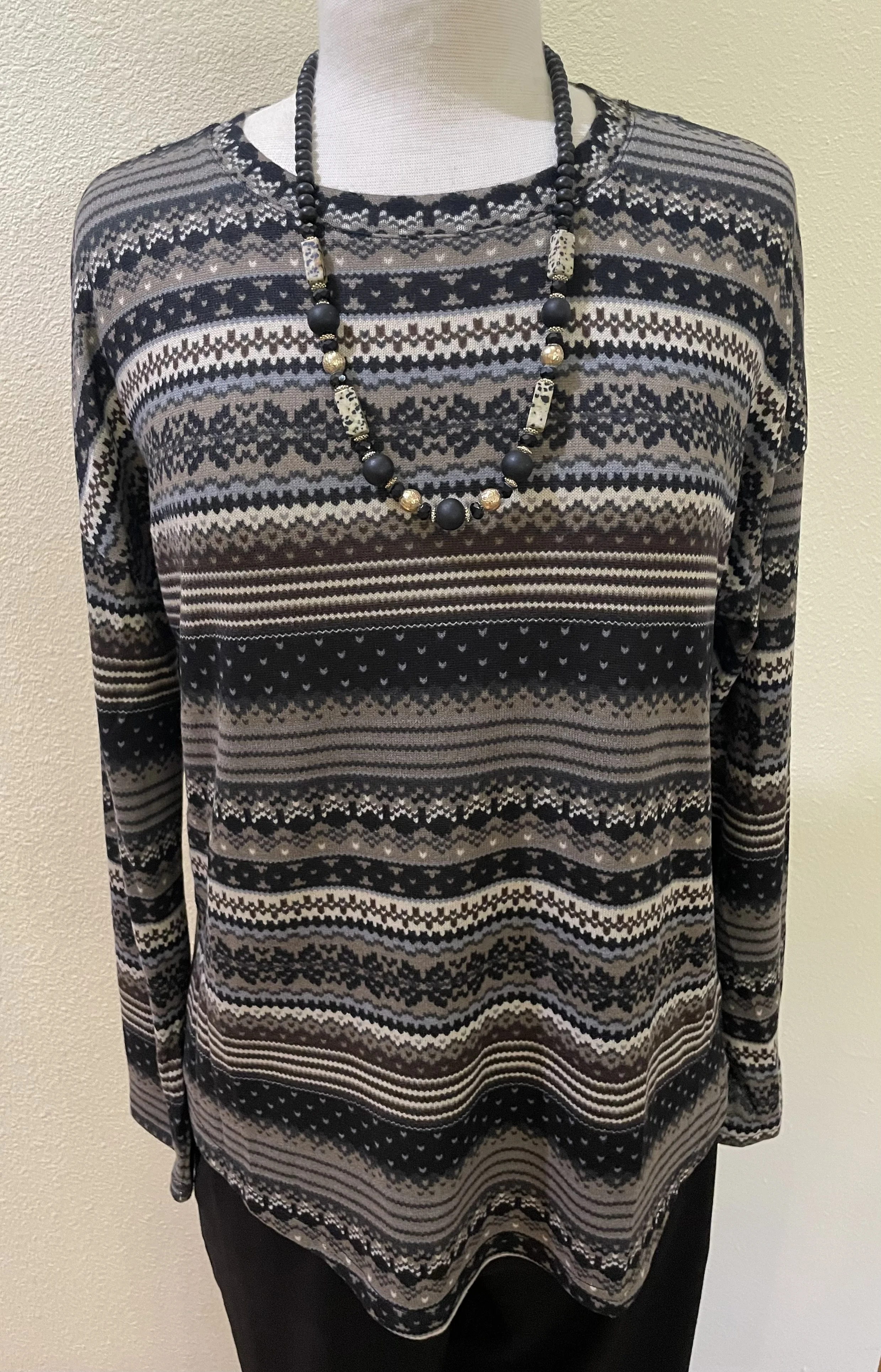 This is an adorable Fairisle Sweater in grey is one of a few cozy styles we have by Papillon.